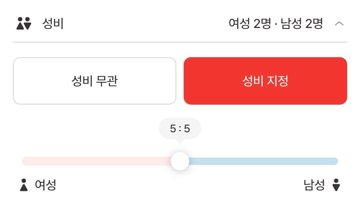 예를 들어, 최소 인원이 4명인 모임이라면 성비를 5:5, 2:8 등으로 설정할 수 있어요.