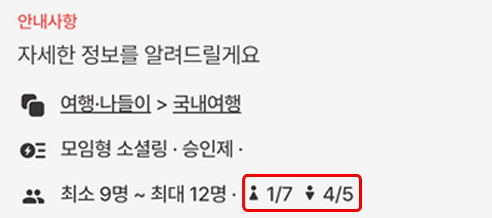 설정한 성비에 맞춰 각 성별별로 모집이 진행되므로, 각 성별로 현재 몇 명이 신청했는지를 확인할 수 있어요.