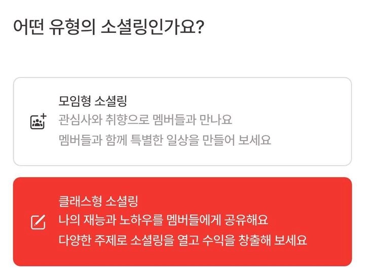 소셜링 유형 선택 시, ‘클래스형 소셜링’을 선택하여 오픈할 수 있고 오직 유료로만 가능해요.