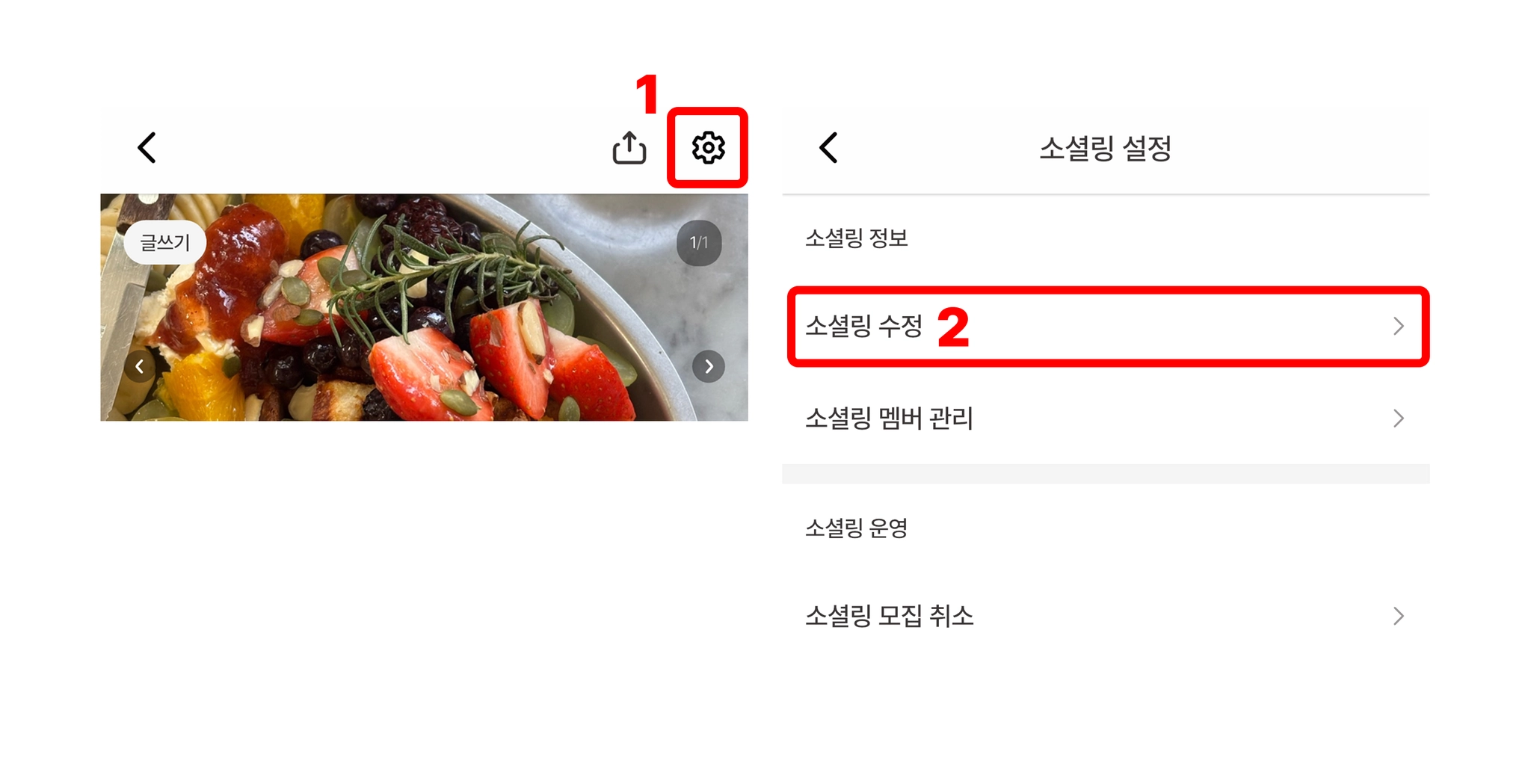 마이페이지 → 모임내역 → 오픈한 소셜링 페이지 접속 → 우측 상단 [톱니바퀴] → [소셜링 수정]