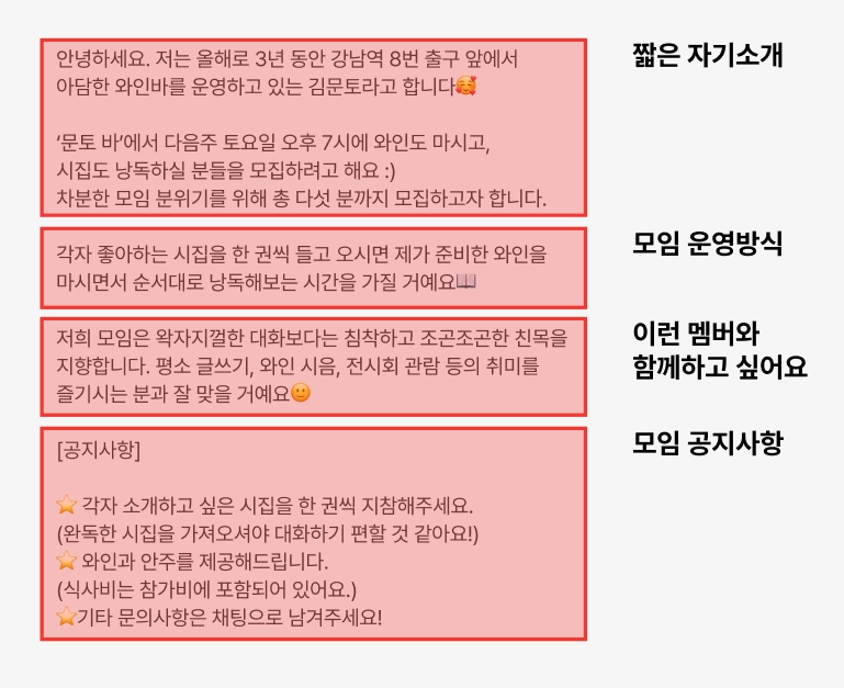 멤버들의 신청 욕구를 일으키는 요소들을 활용하여 호스트님의 색이 드러나는 모임 소개를 완성해보세요