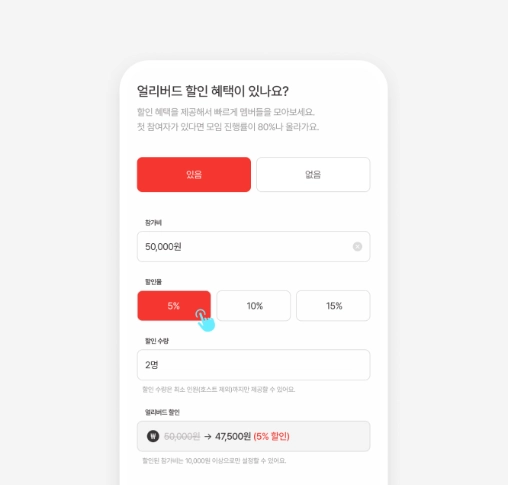 얼리버드 혜택은 모임을 열 때 설정한 ‘최소 인원’만큼만 제공되며,
