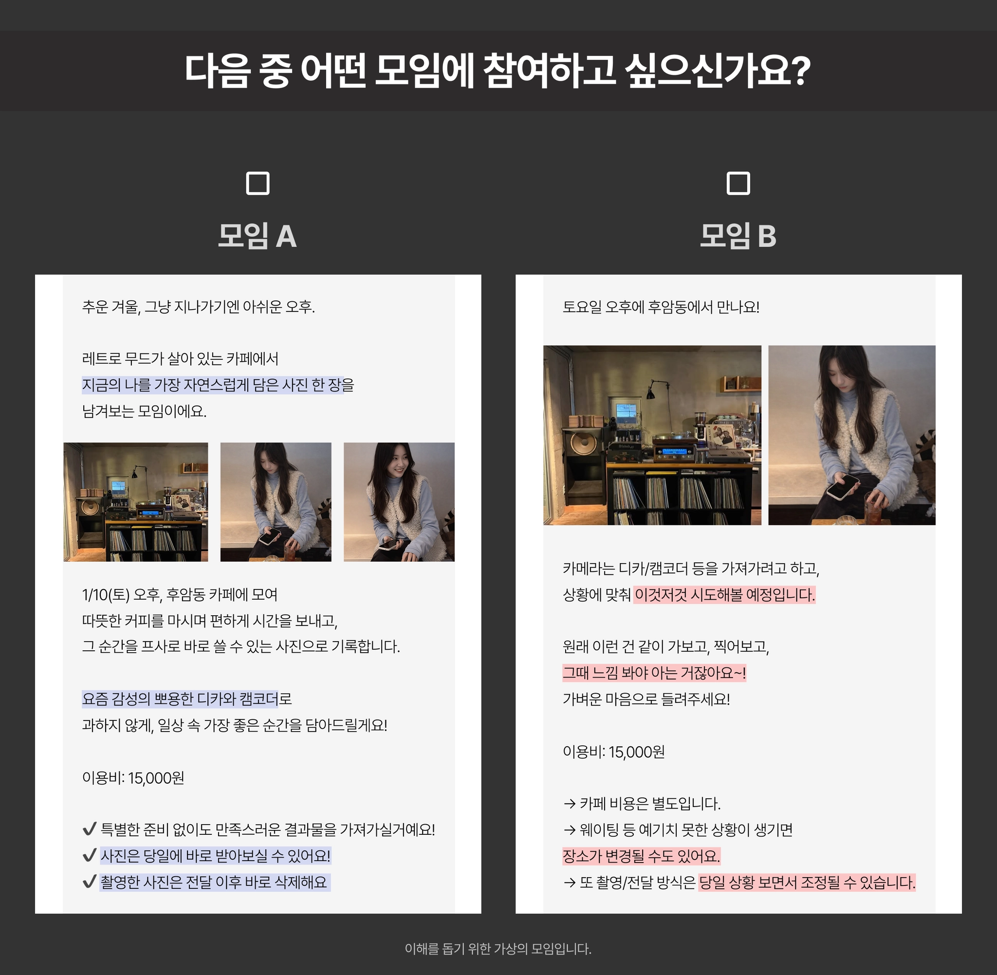 멤버들은 모임에 참여한 내 모습이 빨리 그려질수록 신청하기 쉬워요.