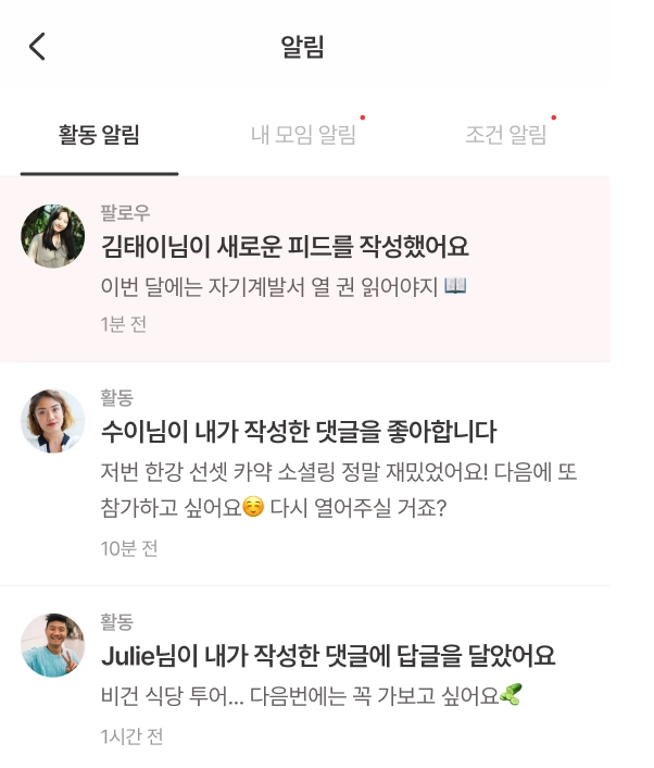 새 모임을 열거나 피드를 작성하면 모든 팔로워에게 푸시 알림이 발송돼요!