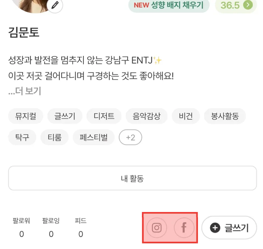 SNS를 연결하면 프로필에 아이콘이 등록돼요.