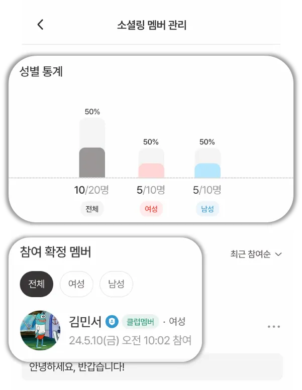 번거로운 관리 과정 없이, 성별 분리 모집 기능을 활용해 더 효율적으로 모임을 운영해보세요